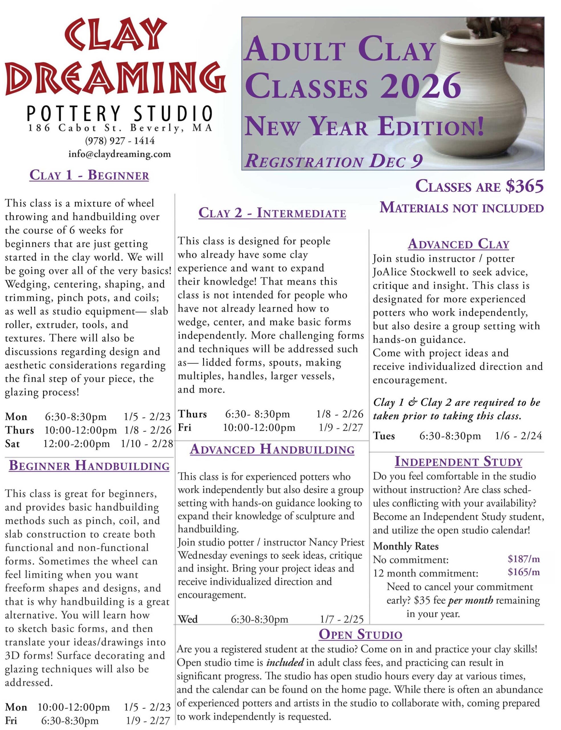 CLAY STUDIO CLASSES OVERVIEW ADULT CLASS INFO KID CLASS INFO
